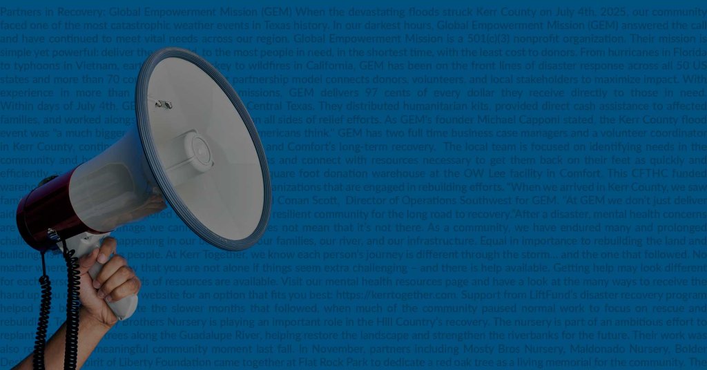 Our Communications and Government Affairs Working Groups ensure consistent, transparent, and unified messaging across all partners involved in disaster recovery. We also work to align city, county, and state partners on key policy decisions, permitting processes, and regulatory timelines, promoting clear coordination and accountability across agencies. By bridging communication between officials, organizations, and residents, KerrTogether strengthens trust, speeds recovery efforts, and ensures accurate information reaches those who need it most.